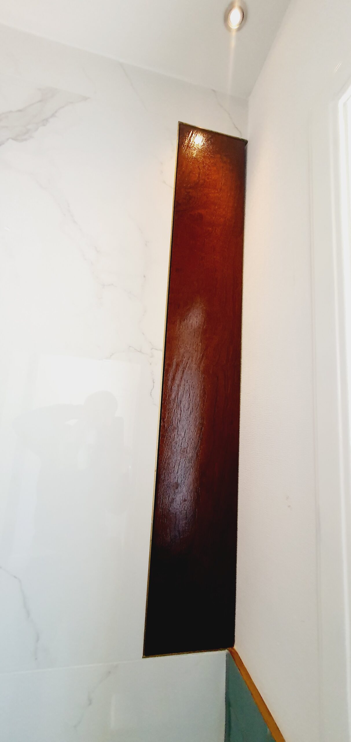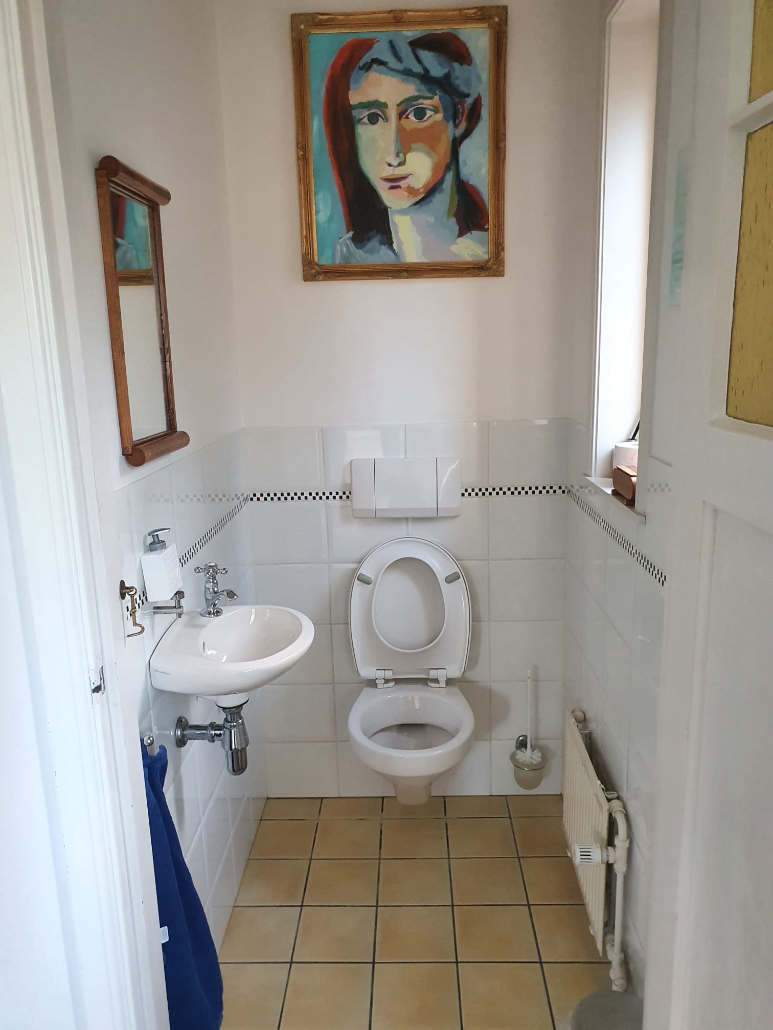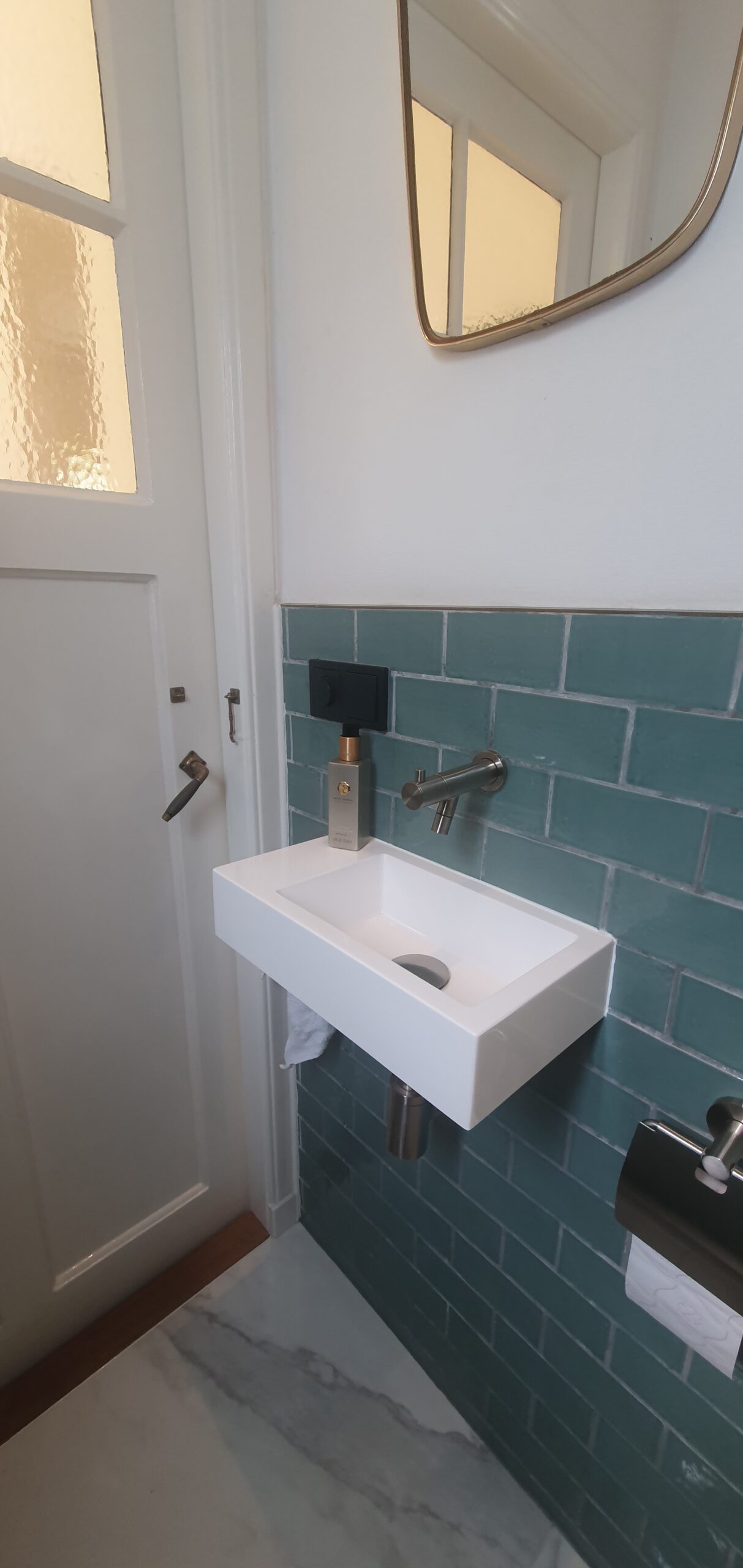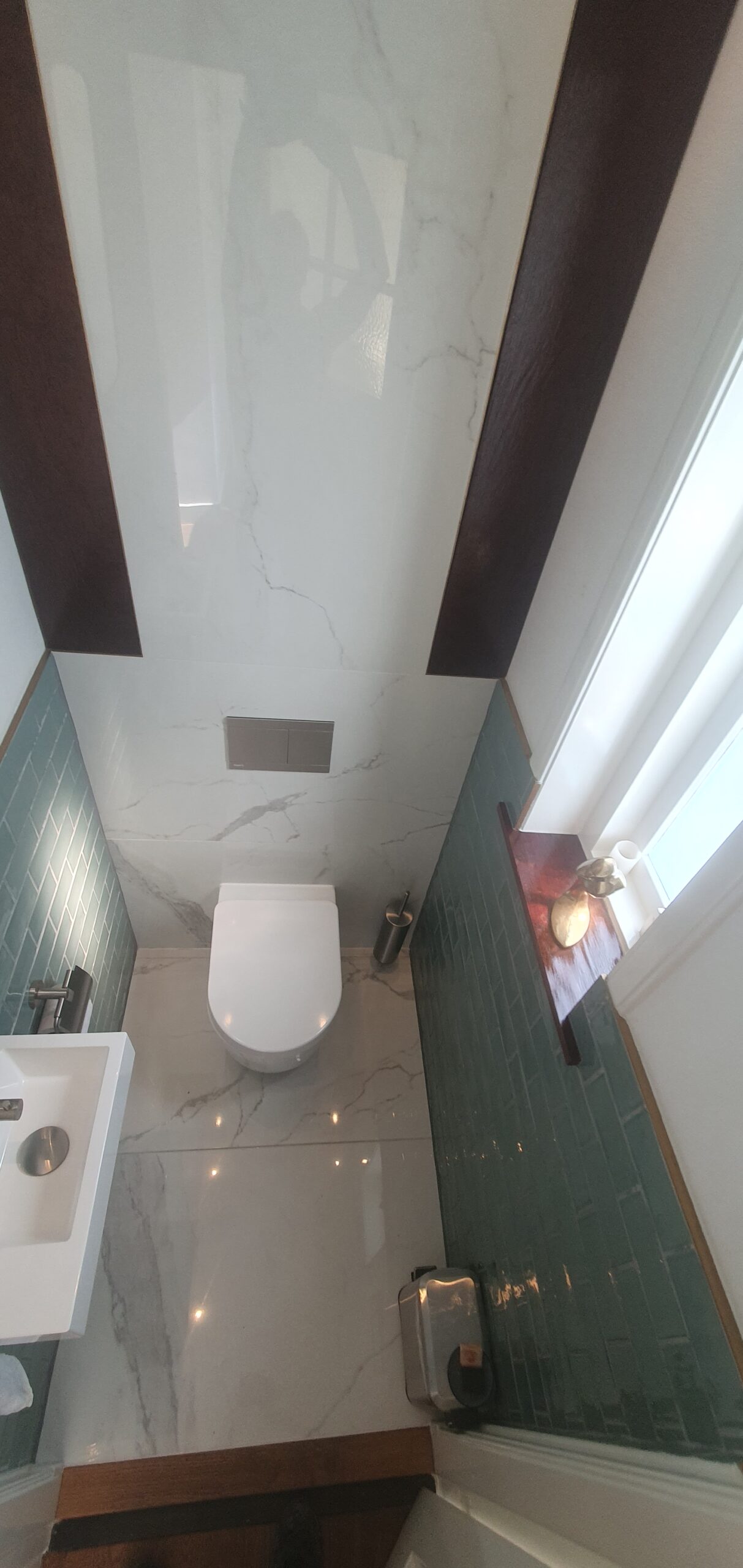 De klant wilde graag een strak design met een sjieke uitstraling. Natuurlijke materialen, art-deco stijlkenmerken en moderne techniek. Het toilet heeft vloerverwarming, automatische afzuiging, automatische en dimbare spotverlichting, ingebouwde remote speakers met bluetooth. Verder is de noodzakelijke voorraad, zoals toiletrollen, bediening voor het achtergrondgeluid en handdoekjes weggewerkt in een blind kastje. Deze is geïntegreerd in de acherwand en voorzien van mahoniefineer. Dit is gespiegeld aan beide kanten. Het fineer komt terug in de vensterbank en het fotolijstje. De tegelranden zijn afgewerkt met messing. De accessoires zijn van geborsteld rvs. De grote tegels met marmerlook maken het geheel af.