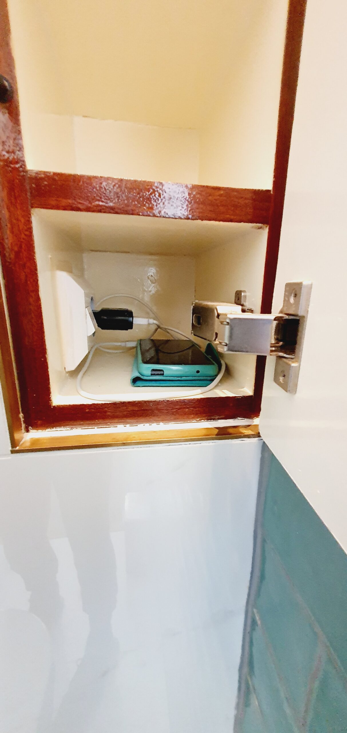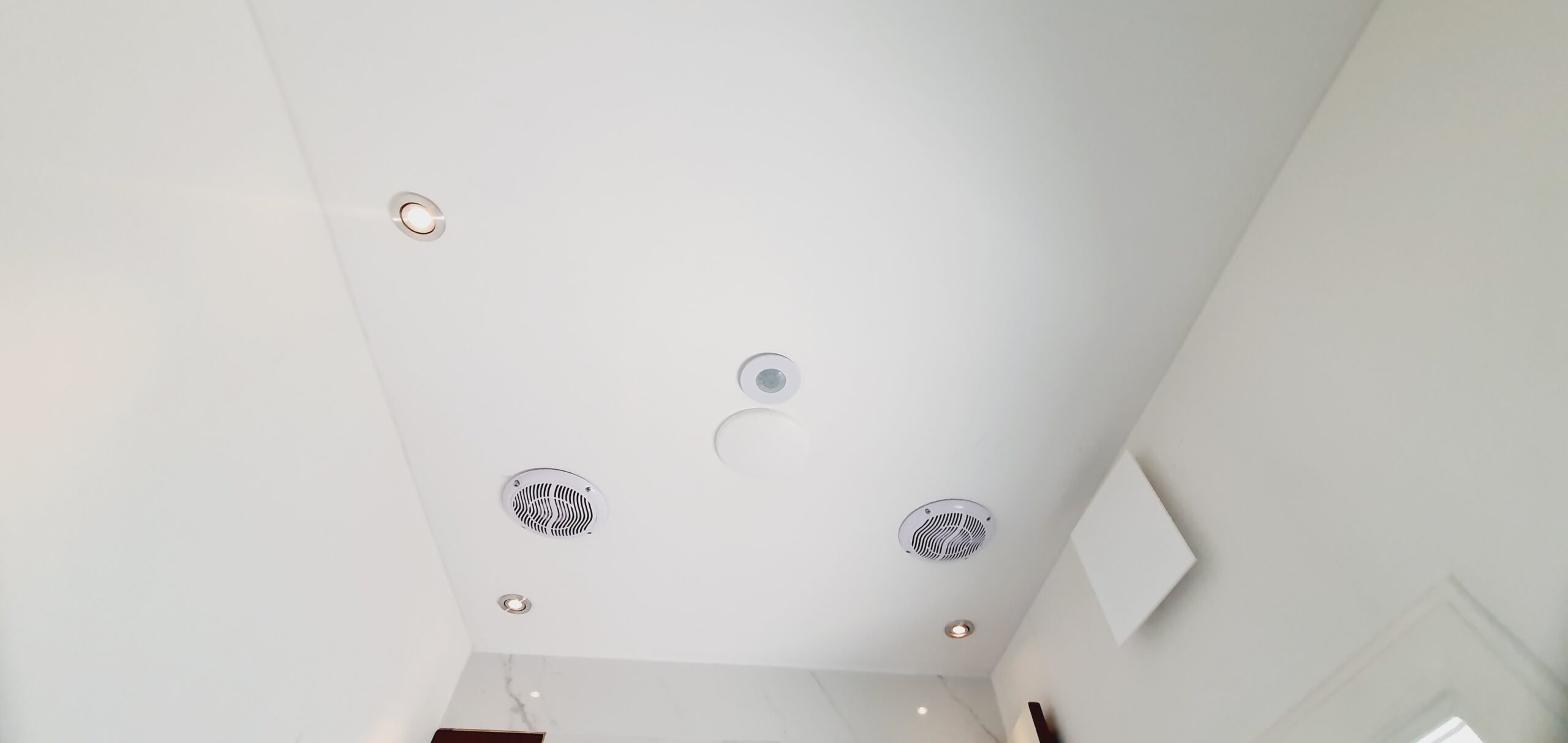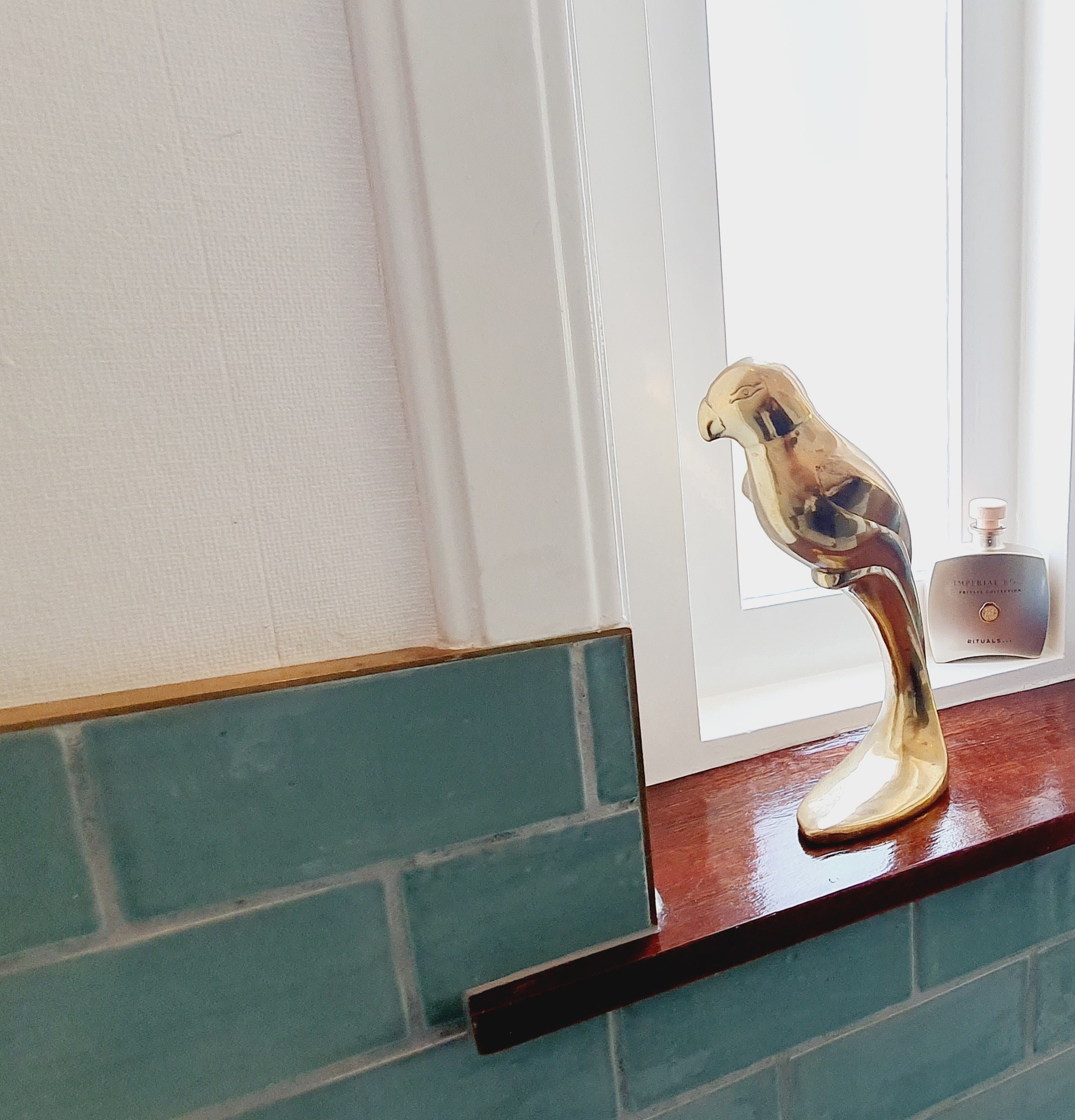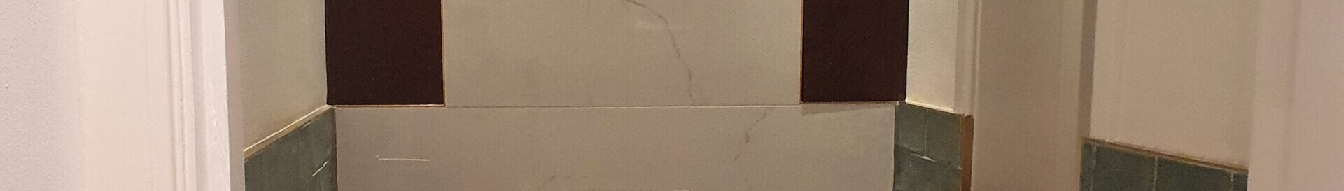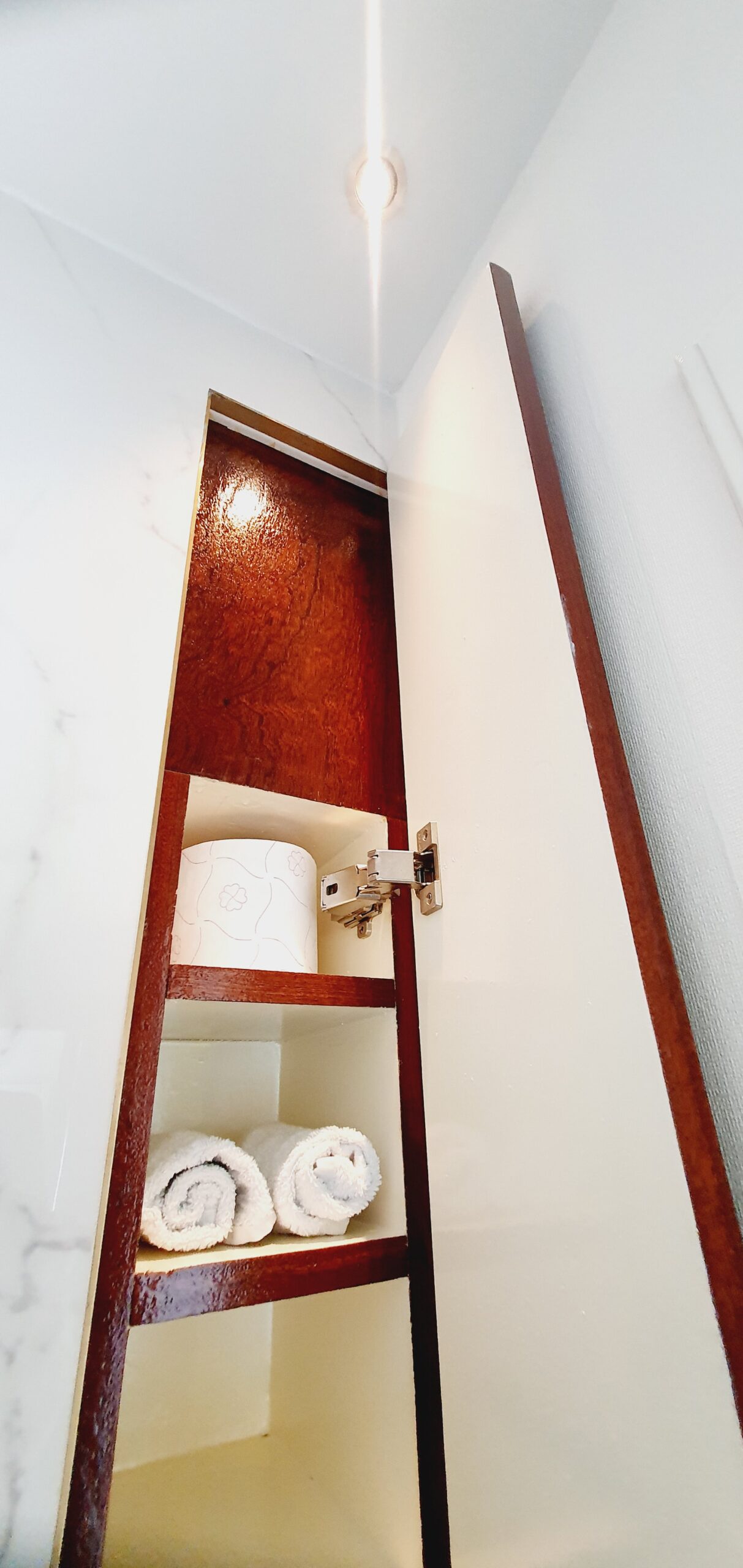 De klant wilde graag een strak design met een sjieke uitstraling. Natuurlijke materialen, art-deco stijlkenmerken en moderne techniek. Het toilet heeft vloerverwarming, automatische afzuiging, automatische en dimbare spotverlichting, ingebouwde remote speakers met bluetooth. Verder is de noodzakelijke voorraad, zoals toiletrollen, bediening voor het achtergrondgeluid en handdoekjes weggewerkt in een blind kastje. Deze is geïntegreerd in de acherwand en voorzien van mahoniefineer. Dit is gespiegeld aan beide kanten. Het fineer komt terug in de vensterbank en het fotolijstje. De tegelranden zijn afgewerkt met messing. De accessoires zijn van geborsteld rvs. De grote tegels met marmerlook maken het geheel af.